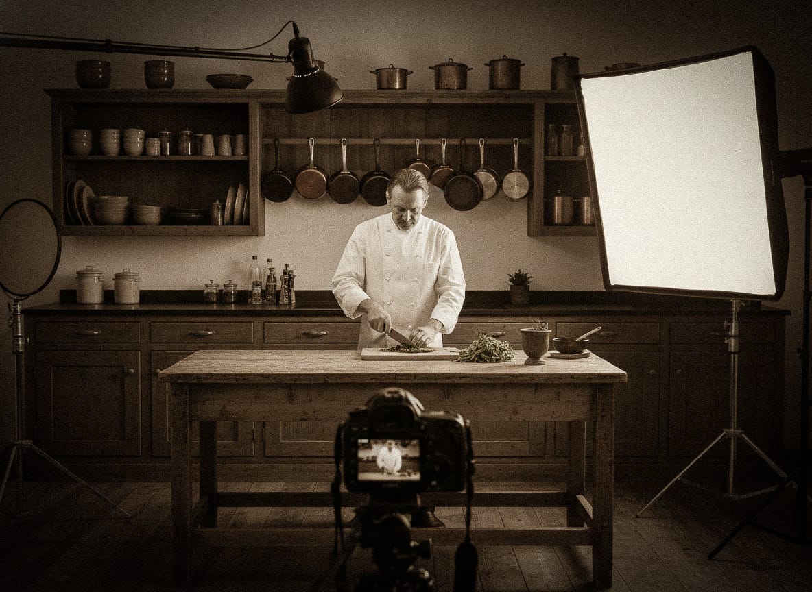 какие кастрюли, где стоять, как должен падать свет, какой оттенок у дерева, почему нельзя бликовать на посуде.